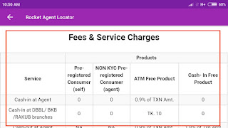 রকেট অ্যাকাউন্টের যেকোনো লেনদেন করলে তার ফি চার্জ কত টাকা কাটবে বা কোনটা ফ্রি তাও উল্লেখ রয়েছে অ্যাপটিতে উপরের স্ক্রিনশটের মত।