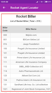 তারপর দেখবেন আপনি যে বিভাগের, যে জেলার এবং যে উপজেলার রকেট অ্যাজেন্ট সার্ভিস সেবা দেখতে চান, সেগুলো উপরের স্ক্রিনশটের মত সিরিয়ালে চলে আসবে।