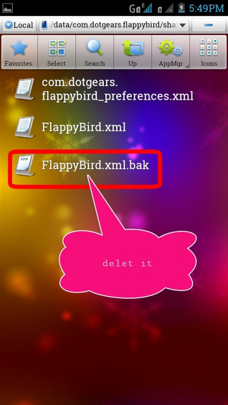 তারপর সেভ করুন এবং ওই ফ্লুডার থেকে ভের হয়ে আবার ডুকুন তাহলে flappybird.xml.bak নামে একটা ফাইল আছে অইটা ডিলিট করুন