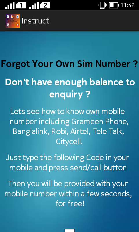 আমাদের অনেক সময় নতুন সিম নাম্বার মনে থাকেনা আবার অনেক সময় নিজের নাম্বার জানার জন্য অন্যের মোবাইলে কল করে কিংবা এসএমএসের মাধ্যমে জানতে হয়, আর ব্যালেন্স না থাকলে নাম্বার জানতে বিড়ম্বনায় পড়তে হয়। আর তাই “Knowyourmobilenumber” এর মাধ্যমে সহজেই কোড ডায়াল করে /এসএমএস করে নিজের নাম্বার জানুন ফ্রী তে। এর মাধ্যমে আপনি গ্রামীন ফোন, বাংলালিংক, রবি, এয়ারটেল, টেলিটক এবং সিটিসেল এর নাম্বার জানতে পারবেন।
