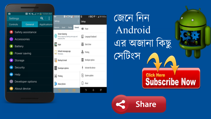 বন্ধু সবাই কেমন আছেন ? আশা করি সবাই ভাল আছেন। আজ আপনাদের জন্য নিয়ে আসলাম এমন একটা টিপস। যা আগে হয়ত অনেকে দেখে ও দেখেননি। আর যারা জানেন তারা আমার ভুল হলে ক্ষমা দৃষ্টিতে দেখবেন। আমরা অনেকেই android phone ব্যভার করি কিন্তু কয়জন phone তাঁর সম্পর্কে ভাল জানি বলেনত? video টা তৈরি করা হয়েছে setting's নিয়ে।