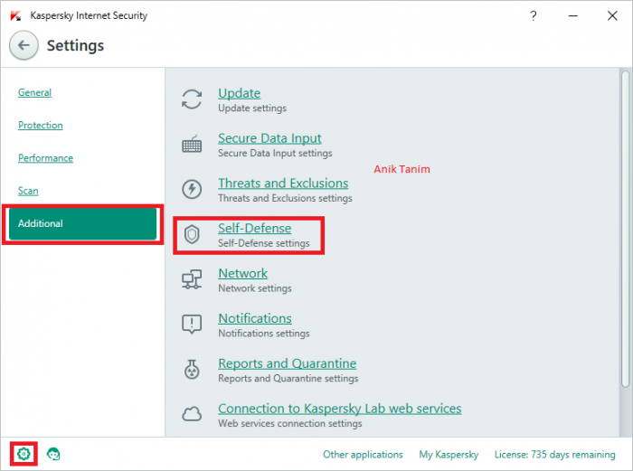 ৩।বাম পাশে নিচে সেটিং আইকন এ ক্লিক করুন,তার পর Additional এ গিয়ে Self-Defense এ ক্লিক করুন