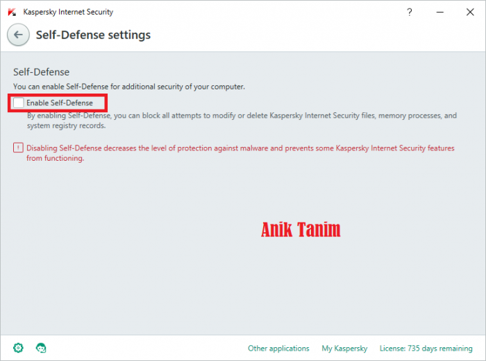 এবার Self-Defense Disable করতে হবে তাই টিক চিহ্ন টা উঠিয়ে দিন,কনফার্ম Window আসলে Ok তে ক্লিক করুন এবং Protection Pause করে দিন টাস্ক বার থেকে Kaspersky এর আইকন এ ডান বাটন ক্লিক করে।