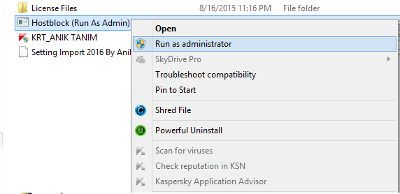 ৭,আমার দেয়া Patch ফাইল টির ভেতরে HostBlocker পাবেন,তাতে ডান বাটন ক্লিক করে Run As Administrator এ ক্লিক করুন।