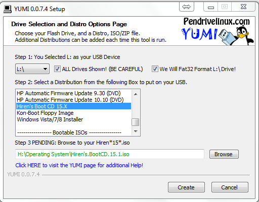 আমার পেন ড্রাইভ এল ড্রাইভ তাই আমি L ড্রাইভ সিলেক করেছি আপানার পেন ড্রাইভ যে ড্রাইভ আপনি সে ড্রাইভ সিলেক করে we Will FAT32 format টিক মার্ক দেন। পপ আপ মেনু হতে হিরেন বুট সিডি 15.x Select করুন। তাহলে নিচের উইন্ডো পাবেন।