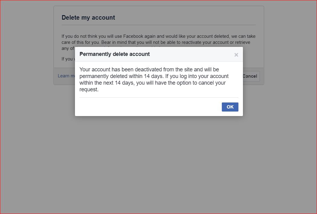 ok তে ক্লিক করার পর আপনার একাউন্টেটি ১৪ দিনের মধ্যে স্থায়ীভাবে ডিলিট হয়ে যাবে।
