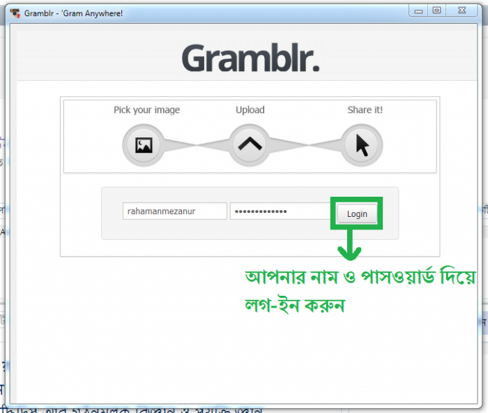 Gramblr সফ্ট টা ডাউনলোড করে ইনস্টল করে নিন। এবার স্টার্ট ম্যানু থেকে সার্চ করে Gramblr সফ্ট টি ওপেন করুন। ওপেন করার পর নিচের মত দেখাবে। আপনার ইউজারনেম ও পাসওয়ার্ড দিয়ে লগ-ইন করুন।::