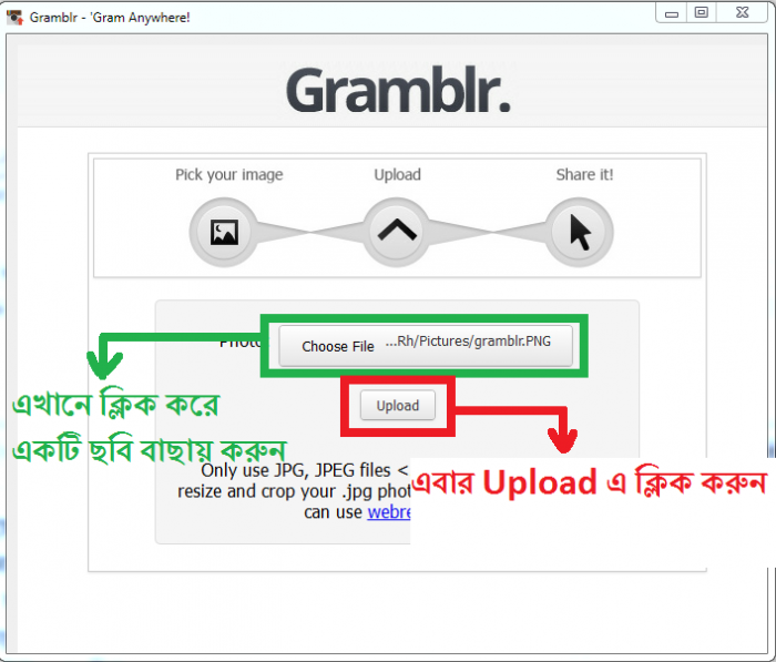 এবার নিচের মত দেখাবে: প্রথমে একটি ছবি বাছায় করুন। তারপর Upload লিখায় ক্লিক করুন।