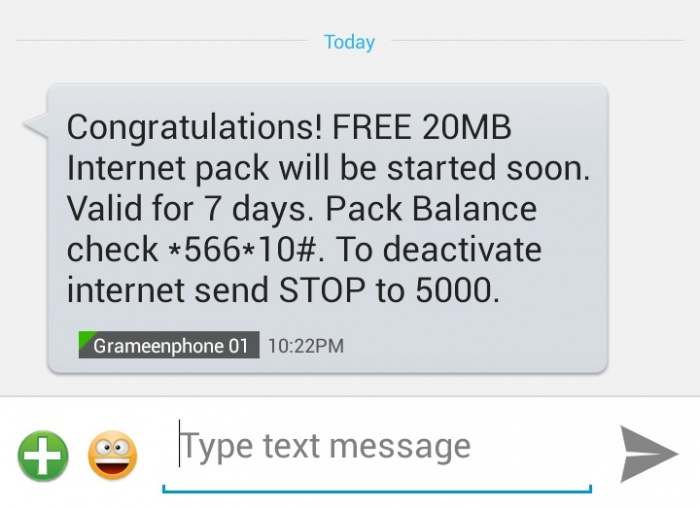 এবার আনন্দের সাথে গ্রামিণফোন সিমে ২০ এম বি ফ্রি ইন্টারনেট ব্যবহার করুন। সবার জ্ঞাতার্থে জানিয়ে রাখি এই ফ্রি ২০ এম বি ইন্টারনেট এর মেয়াদ ৭ দিন। এবং ইন্টারনেট ব্যালেন্স জানতে ডায়াল করুন *121*1# অথবা *566*10#
