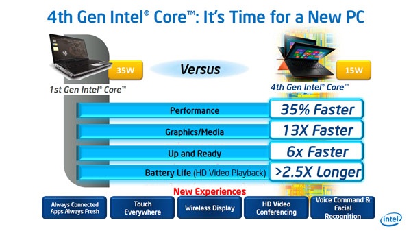 ইন্টেল মোবাইল কম্পিউটিং এর জগতে নিয়ে আসছে নতুন প্রযুক্তি। সম্প্রতি ইন্টেল তাদের নতুন প্রসেসর এর কথা ঘোষণা করেছে। এই প্রসেসর গুলোতে ফীচার এর ক্ষেত্রে জোর দেয়া হয়েছে Low power consumption এর উপর। বাকি ফীচার গুলি নিচের ছবি তে দেখা যাচ্ছে। এই প্রসেসরগুলো তৈরী করা হয়েছে নতুন Haswell Architechture ব্যবহার করে।
