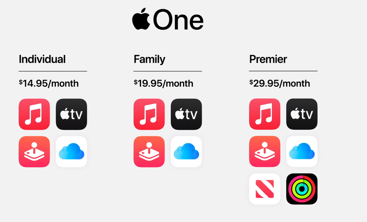 জানা গেছে Apple One কয়েকটি পৃথক স্তরের বান্ডেল অফার করবে। যার মধ্যে একটি Individual অপশন যার ব্যয় হবে প্রতি মাসে 14.95 ডলার যাতে থাকবে, Apple Music, Apple TV Plus, Apple Arcade এবং 50GB iCloud Storage। অন্য দিকে ফ্যামিলি প্যাকেজে থাকবে ২০০ জিবি স্টোরেজ যাতে প্রতি মাসে ব্যয় হবে ১৯.৯৫ ডলার।