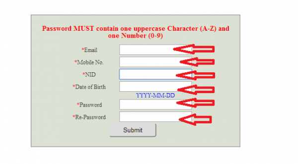 ই-মেইল, মোবাইল নং দিন, এনআইডি ঘরে আপনার আইডি নাম্বার হুবহু লিখুন,