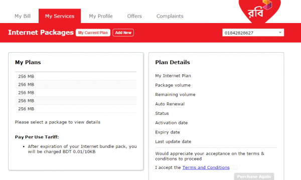 সেখান থেকে My Services এ গিয়ে Internet packages এ গিয়ে ২৫৬ মেগাবাইট পারচেজ করুন একদম ফ্রি। যতবার খুশি।
