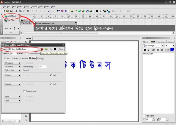 এবার টেকটিউনস লেখাকে এনিমেশন দেবার পালা এনিমেশন দিতে হলে Add Effect বাটনে ক্লিক করুণ।