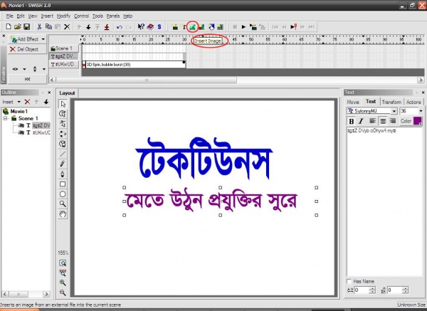 এবার আমরা আরেকটি Text এনিমেশন নিব- নিতে একই নিয়মে Insert Text বাটনে ক্লিক করুণ। তারপর এনিমেশন এর মধ্যে ছবি দিতে হলে Insert Image বাটনে ক্লিক করুণ।