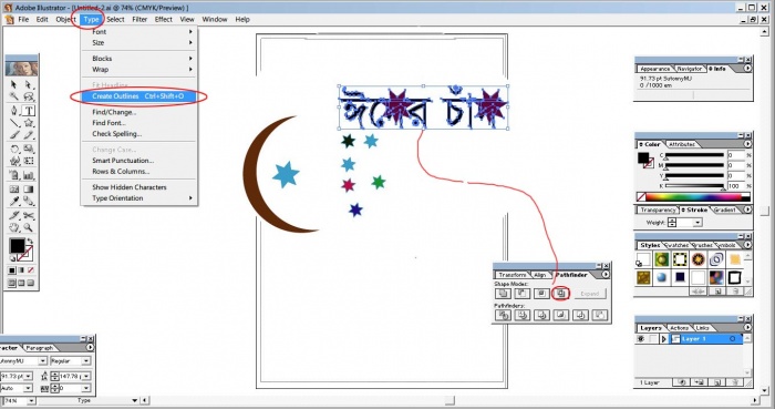 এবার আমরা টাইপ টুল সিলেক্ট করে ঈদের চাঁদ লেখাটি লিখে নিচের মত সেপ নিয়ে কাজ করব।