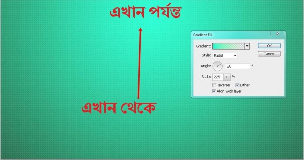 ১৬.এখন পূর্বের মতো LAYER>NEW FILL LAYER>GRADIENT কমান্ড দিন।তাহলে একটি ডায়ালগ বক্স আসবে সেখানে নিচের মতো সেটিংস দিয়ে OK করুন।