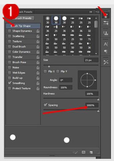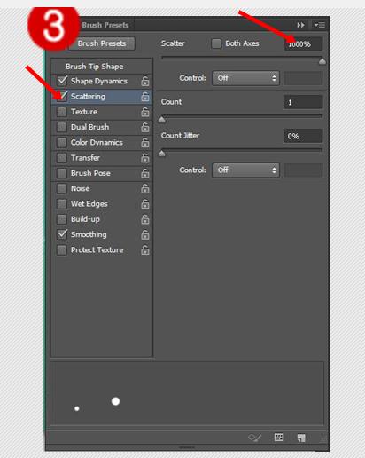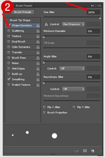 ১৫.এখন ডানদিকের ব্রাশ প্যানেলে ক্লিক করুন।এবং১ নং ২ নং ৩ নং চিত্র অনুযায়ি সেটিংস দিন।