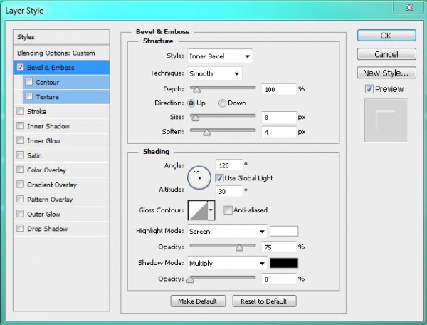 ১৩.এখন লেয়ার প্যালেট থেকে FILL এর মান দিন 0 ।এবার লেয়ার প্যালেটের নিচে ADD A LAYER STYLE আইকোণে ক্লিক করে BEVEL & EMBOSS সিলেক্ট করুন।তাহলে একটি ডায়লোগ বক্স আসবে।নিচের মত সেটিংস দিন।