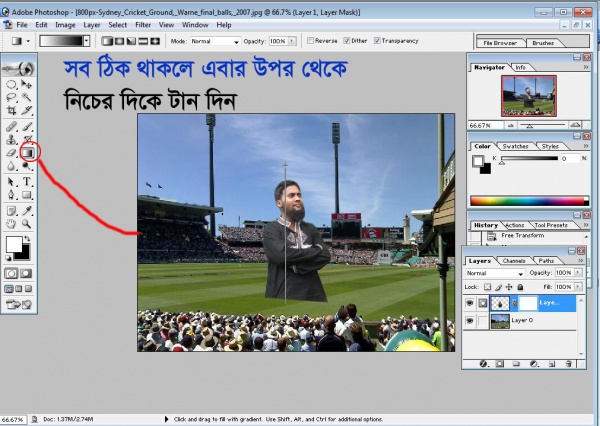 তাহলে টুলবার থেকে Gradient টুল সিলেক্ট করুন তারপর ছবির উপর উপরের থেকে নিচে টান দিন।