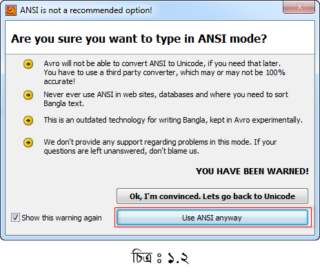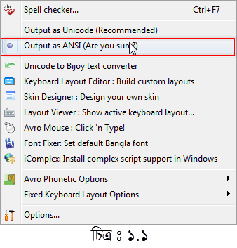 ২. এবার Avro Settings > Output as ANSI > Use ANSI anyway (চিত্র ১.১ ও ১.২)