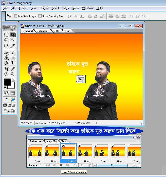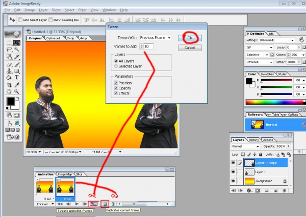 এবার আমরা ছবিকে এনিমেশন দিব। তার আগে আমরা একটি Animation টাইম লাইন থেকে Duplicate Curent Frame বাটনে ক্লিক ক্লিক করে একটি ফ্রেম নিন, তারপর Tweens Twens বাটনে ক্লিক করে Frames To add বক্স ১০ লিখে Ok করুন। কম বা বেশি নেওয়া যাবে এনিমেশন অনুযায়ী।