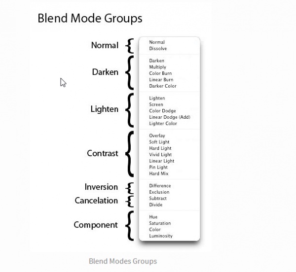 শুরুতেই উল্লেখ করেছি Blend mode (২৭+২)=২৯ টি। খুব যৌক্তিক কারনে এই ব্লেন্ড মোড গুলোকে কয়েকটি গ্রুপে বিভক্ত করা হয়েছে। গ্রুপ বিন্যাস দেখে নিন নিচের চিত্রটি থেকে-