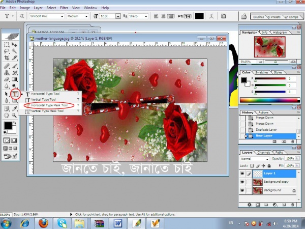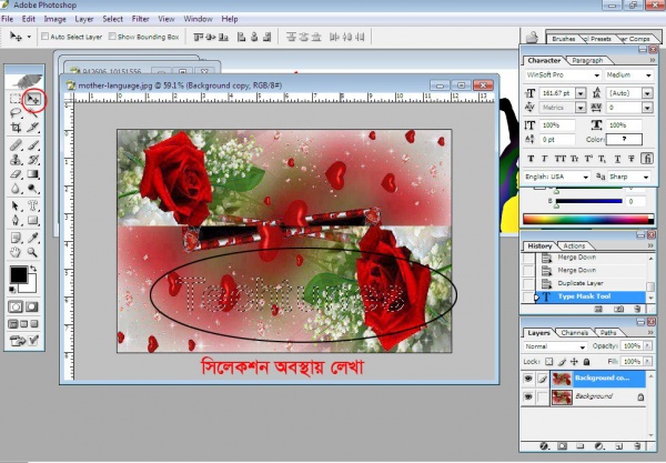 এবার টুলবার থেকে Horizontal Mask Type Tool টাইপ টুল সিলেক্ট করে উপর কিছু লেখা লিখুন যে লেখা আপনি ছবির ভিতর দিতে চাচ্ছেন।