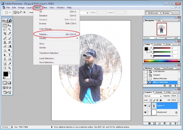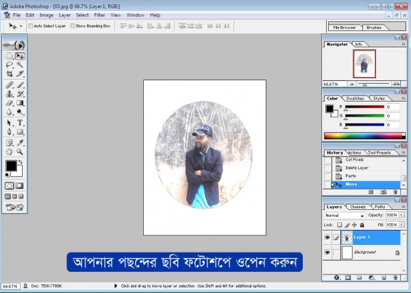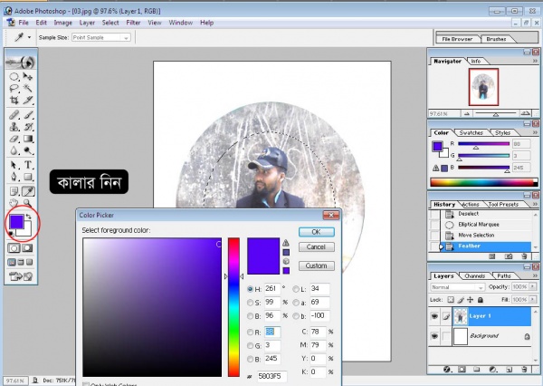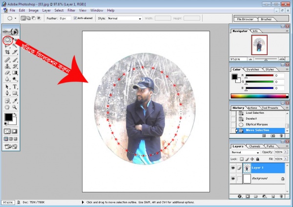 এবার Toolbar থেকে Eliptical Marquee tool সিলেক্ট করে আপনার ছবির নির্দিষ্ট অংশ সিলেক্ট করুন।