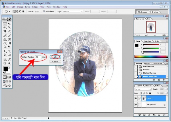 এবার Feather বক্স এ ৪০ অথবা পছন্দের মান দিয়ে Ok তে ক্লিক করুন।