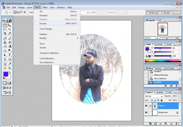 এবার মেনু থেকে Select > Inverse ক্লিক করুন। অথবা কিবোর্ড থেকে SHIFT+CTRL+I প্রেস করুন। তাহলে নিচের ছবির মত সিলেকশন হবে।
