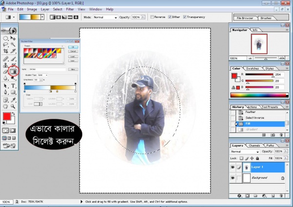 এবার সবশেষ কি-বোর্ড থেকে ALT চেপে ধরে BACKSPACE প্রেস করুন, অথবা Tool Bar থেকে Gradient Tool সিলেক্ট করে পছন্দের কালার সিলেক্ট করে ছবির মধ্যে টান দিন।