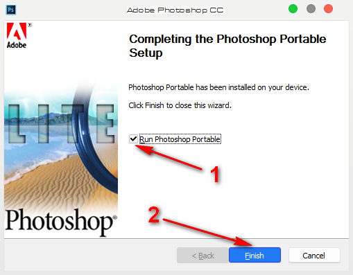 ৮। ইস্টল হতে ৫/৭ মিনিট সময় লাগবে অপেক্ষা করুন ইস্টল কমপ্লিট হওয়ার পর নিচের মত স্ক্রিন দেখতে পাবেন Run Photoshop Portable বক্স সিলেক্ট করে Finish এ ক্লিক করলেই পেয়ে যাবেন অ্যাডবি ফটোশপ সিসি এর ফুল ভার্সন ।