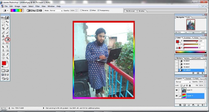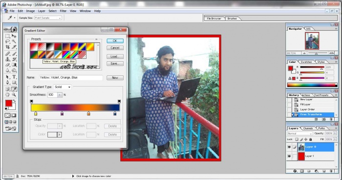 এবার আসা যাক অন্য রকম কালার দেওয়া, সেজন্য Gradient Tool সিলেক্ট করে পছন্দের কালার সিলেক্ট করে ড্রাগ করুন।