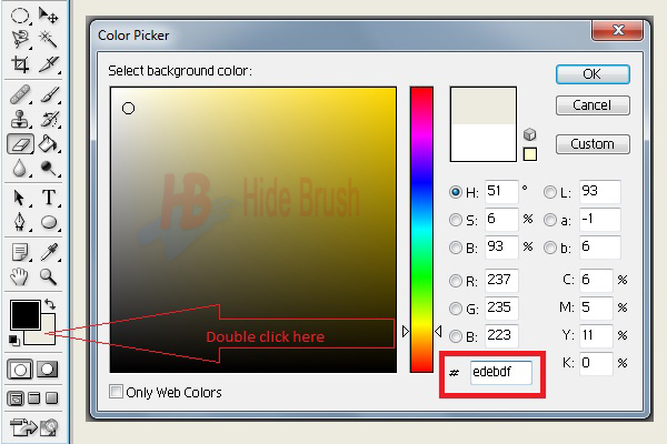প্রথমেই আপনার Photoshop open করুন এবং background color #edebdf সেট করে নিন। Background color সেট করতে Background color picker এর উপর ডাবল ক্লিক করুন এবং color বক্সে #edebdf কোডটি লিখুন ও OK চাপুন।