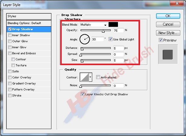 তারপর Drop shadow চাপুন এবং Blend Mode-Multiply, Opacity 75%, Angle 30, check Use Global Light, Distance 5 pixels, Spread 0 pixels and the Size is 5 pixels সেট করে OK চাপুন।