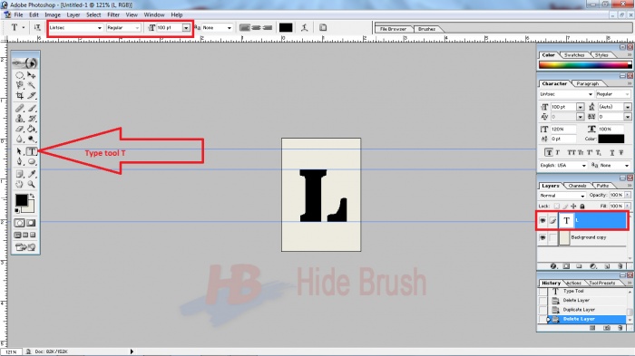 এবাপ আপনার rectangle এর উপর L অক্ষরাট লিখুন অথবা (যেকোন অক্ষর যা আপনার প্রয়োজন) অক্ষরটি অবশ্যেই rectangle এর মাঝে লিখবেন। L অক্ষরটি লেখার জন্য Type tool (T) অথবা keyboard থেকে T চাপুন। Lintsec font টি Select করুন না থাকলে এখান থেকে Download করে নিন। এখন font সেট করে নিন style regular এবং size 100 pt. এ