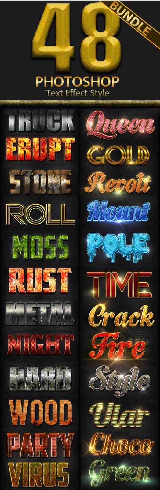 48 Photoshop Text Styles Bundle Part 1 is with high quality can produce effect more perfect and interesting for your text, all style effects work only with one click.