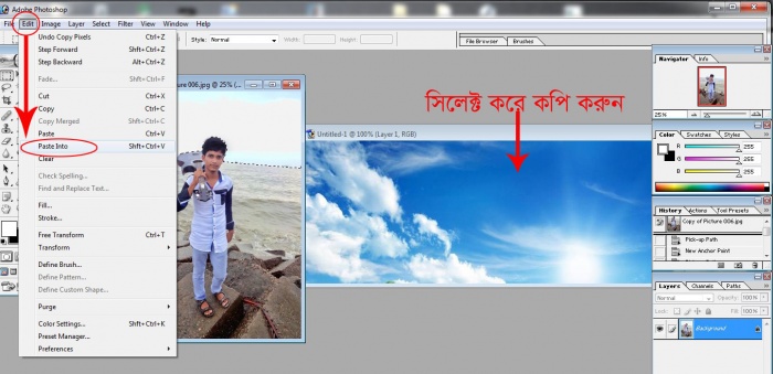 তারপর যে আকাশটি আপনার পিছনে দিবেন সেটি ফটোশপে ওপেন করুন, আর আপনার কাছে না থাকলে গুগল থেকে সার্চ করে নিয়ে নিন।তারপর কি-বোর্ড থেকে CTRL+A দিয়ে পুরো আকাশ সিলেক্ট করুন, তারপর CTRL+C দিয়ে কপি করুন। এখন যে ছবিতে নিবেন সেখানে মাউস দিয়ে ক্লিক করে মেনুবার থেকে Edit>Paste Info তে ক্লি করুন।