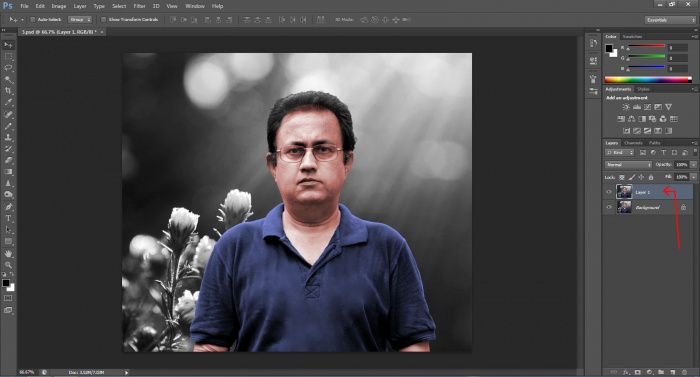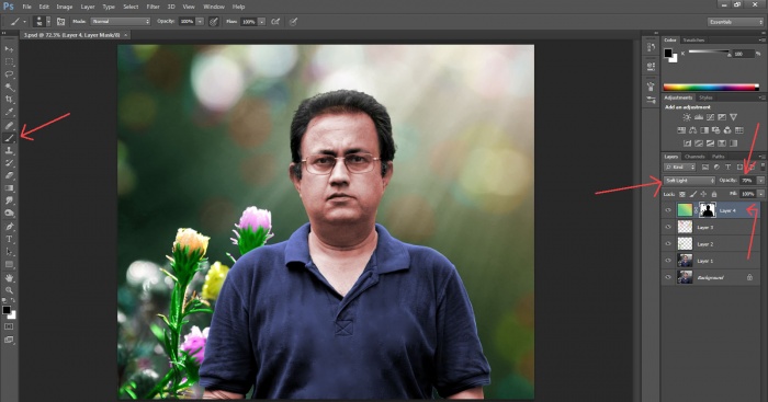 ৫. সবশেষে, লেয়ার প্যানেলের নীচের দিকের ২ নং বাটনটি অর্থাৎ, এড লেয়ার মাস্ক বাটনটি ক্লীক করে মাস্কিং লেয়ারের সাদা বাক্সটি সিলেক্ট রেখে ফোরগ্রাউন্ড কালারে কালো রঙ নিয়ে সাবধানে সফ্ট রাউন্ড ব্রাশ নিয়ে মানুষের ছবিটিতে ঘষে দিন (মনে রাখবেন, সুক্ষ্ম যায়্গাগুলিতে ছবিটি বড় করে নেবেন এবং ব্রাশ সাইজ ছোটো করে নেবেন, তবু যদি ভুল হয় তবে x কী চেপে ভুল যায়্গাগুলিতে ঘষে দেবেন)।