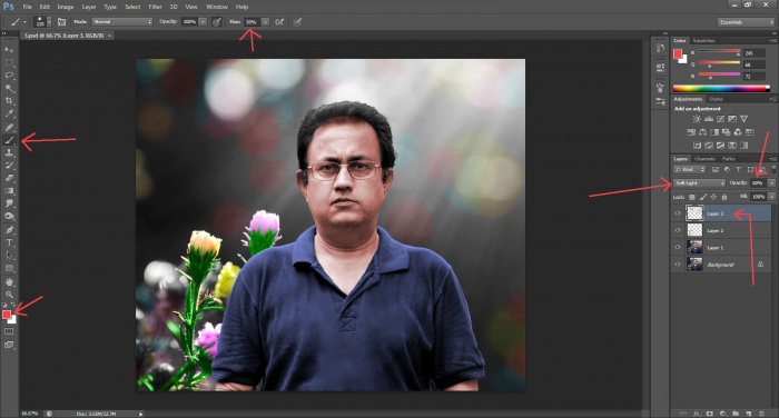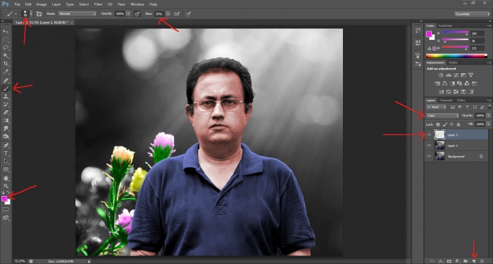 ২.এবারে একটি নতুন লেয়ার নিয়ে লেয়ারের ব্লেন্ড মোডটি নর্মাল এর জায়গায় কালার করে দিন। ব্রাশ টুল সিলেক্ট করে ব্রাশের হার্ডনেস ৫০ করে দিন এবং ফোরগ্রাউন্ড কালারে সবুজ রঙ নিয়ে ফুলগুলির পাতাগুলিকে সবুজ রঙ করে দিন (প্রয়োজনে ctrl এবং + চিহ্ন চেপে ছবিটিকে বড় করে নিয়ে ব্রাশের সাইজ ছোটো করে কাজ করুন) ব্রাশের ফ্লো ৫০ থেকে ৬০ করে নেবেন।এরপর ফোরগ্রাউন্ড কালারে রঙ পরিবর্তন করে করে ফুলের বাকি অংশ গুলিকে রঙ করে ফেলুন।