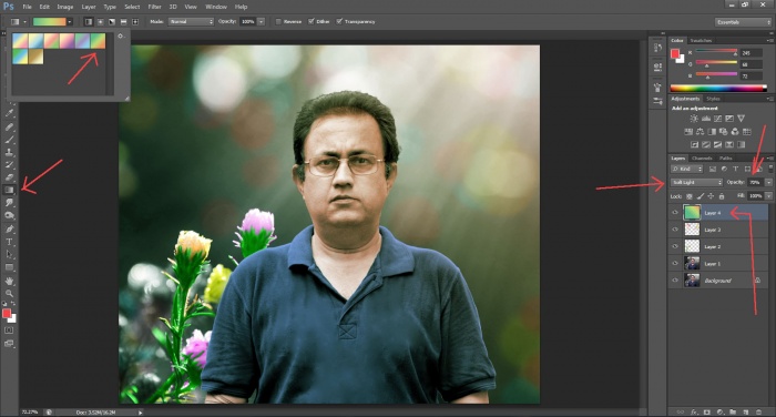 ৪.আবার আরেকটি নতুন লেয়ার নিয়ে লেয়ারের ব্লেন্ডমোডটি নর্মালের স্থানে সফ্টলাইট করে দিন ও লেয়ারের ওপেসিটি ৭০ এর কাছা-কাছি রেখে টুলবার থেকে গ্র্যাডিয়েন্ট টুল সিলেক্ট করে সুন্দর একটি গ্র্যাডিয়েন্ট কালার নীয়ে ছবিটির মাঝখান থেকে কোনা-কুনি করে ডান দিকের উপরের কোন পর্যন্ত টানুন।