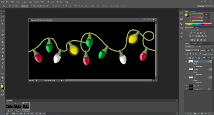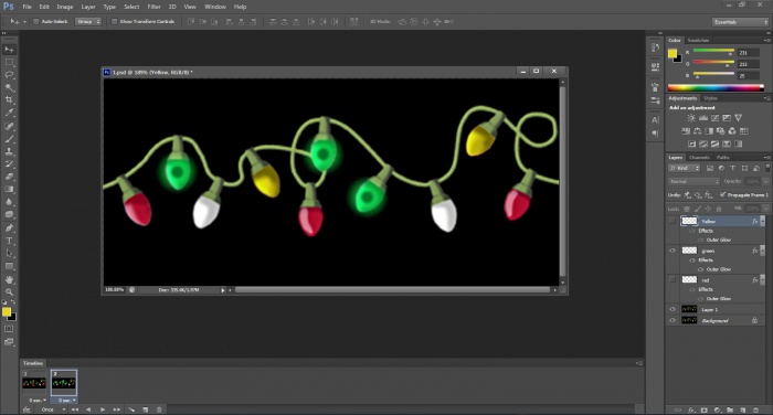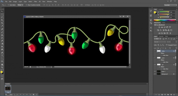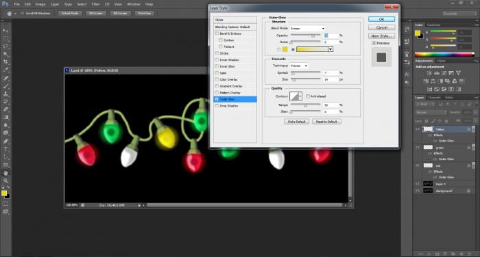আবার, একই পদ্ধতিতে অন্য একটি নতুন লেয়ার নিয়ে green নাম দিয়ে সবুজ bulb-গুলিতে ও yellow- নাম দিয়ে অন্য একটি লেয়ারে হলুদ রঙ করে দিন, এরপর, red লেখা লেয়ারটি সিলেক্ট করে লেয়ারের নামের পাশের খালি জায়গায় ডাবল ক্লীক করুন ও layer style-এর যে প্যানেলটি আসবে তাতে outer glow সিলেক্ট করে technique-এর জায়গায় precise-করে স্প্রেড-এ 7 এবং সাইজের স্থানে ১৪ করুন ও কালার box-এ লাল রঙ করে OK- করুন,