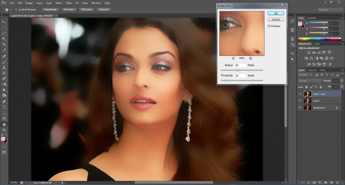 এখন, আবার ctrl + j- চেপে আরেকটি duplicate copy তৈরী করুন এবং ফিল্টার > ব্লার > সারফেস ব্লারে ক্লীক করুন, ফলে সারফেস ব্লারের প্যানেল আসবে তাতে radius = 40 ও threshold = 33 - করে ok মেরে, layer- প্যানেলের opesiti 50 করে দিন I (নীচের ছবি দেখুন)