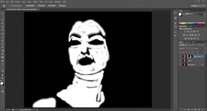৫. এবারে, মাস্কিংটি ঠিক হলো কিনা দেখার জন্য alt চেপে কালো থাম্বনেইলে ক্লীক করুন ও যেই যায়্গাগুলিতে দাগ দাগ আছে সেগুলি ব্রাশ দিয়ে ঘষে দিন I (নীচের ছবি দেখুন)