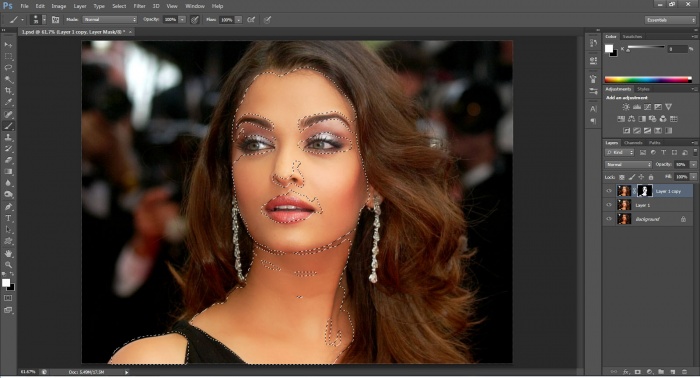 এবারে, ALT চেপে layer প্যানেলের নীচের add layer mask বাটনে ক্লীক করে সফ্ট রাউন্ড ব্রাশ নিয়ে ব্রাশ সাইজ ছোট-বড় করে ফোর গ্রাউন্ড কালার সাদা রেখে স্কীন এ ব্রাশ করুন, কিন্তু লক্ষ রাখবেন যেনো চুল, ড্রেস, নাকের ভাজ,ভুরু বা চোখ ইত্যাদিতে ব্রাশের ছোয়া না লাগে I(নীচের ছবি দেখুন)