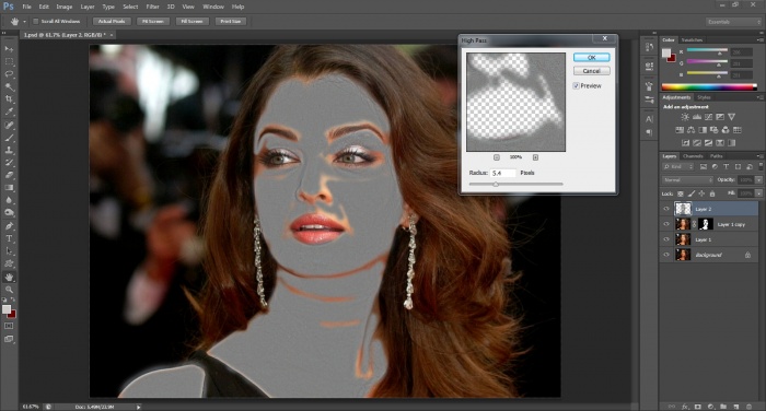 ৭. এখন, নতুন layer টিকে একদম উপরে নিয়ে গিয়ে স্কীন এর texure ঠিক করার জন্য filter> other > high pass- এ ক্লীক করে radius- এর স্লাইডার টিকে ডানে ততক্ষন পর্যন্ত টানুন যতক্ষণ না চকচকে ভাব শুরু হয়, ok করুন(নীচের ছবি দেখুন আমি এখানে 5.4 দিয়েছি) I