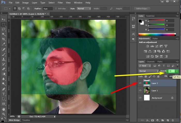 এখন পতাকার লেয়ারটি সিলেক্ট করে Opacity 50% করে দিতে হবে।