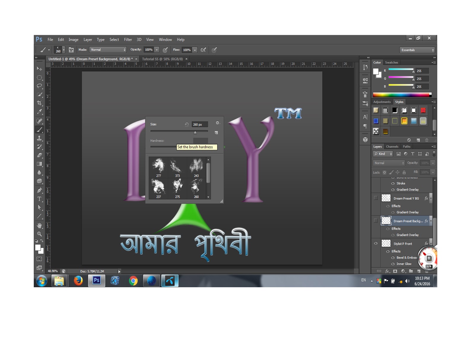 বিভিন্ন গ্রেডিয়েন্ট ব্যবহার করে ব্রাশগুলোকে Design করি। এবং সর্বশেষে একটি পূর্ণাঙ্গ ফটো তৈরী করি। নিচের মতঃ