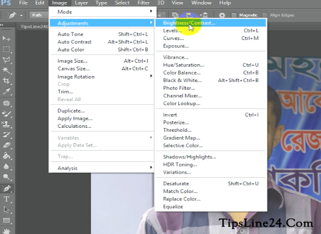 এবার নিচের ছবিতে লক্ষ করুন Image এ জান তারপর তারপর Adjustments তারপর Brightness/Contrast এ জান। মানে এরকম Image>Adjustments>Brightness/Contrast